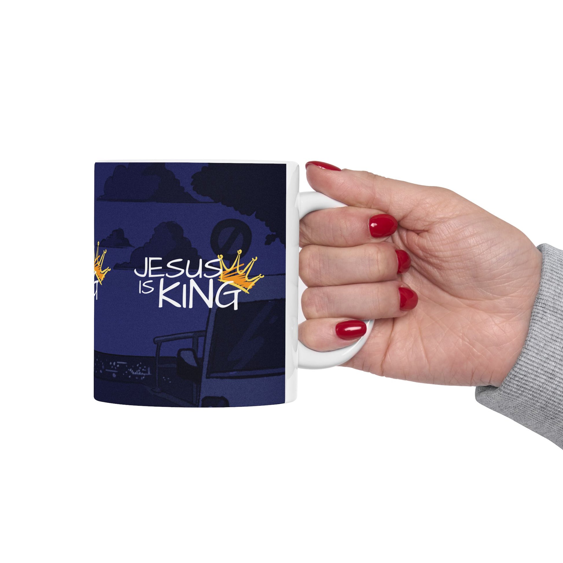 A ceramic mug available in 11oz and 15oz sizes, featuring a fun depiction of Jesus as King for those who want to affirm their faith in Christ. Perfect for enjoying your morning coffee or tea with a touch of spirituality. Great gift for Christians, perfect for Christmas, Easter, and other religious celebrations.