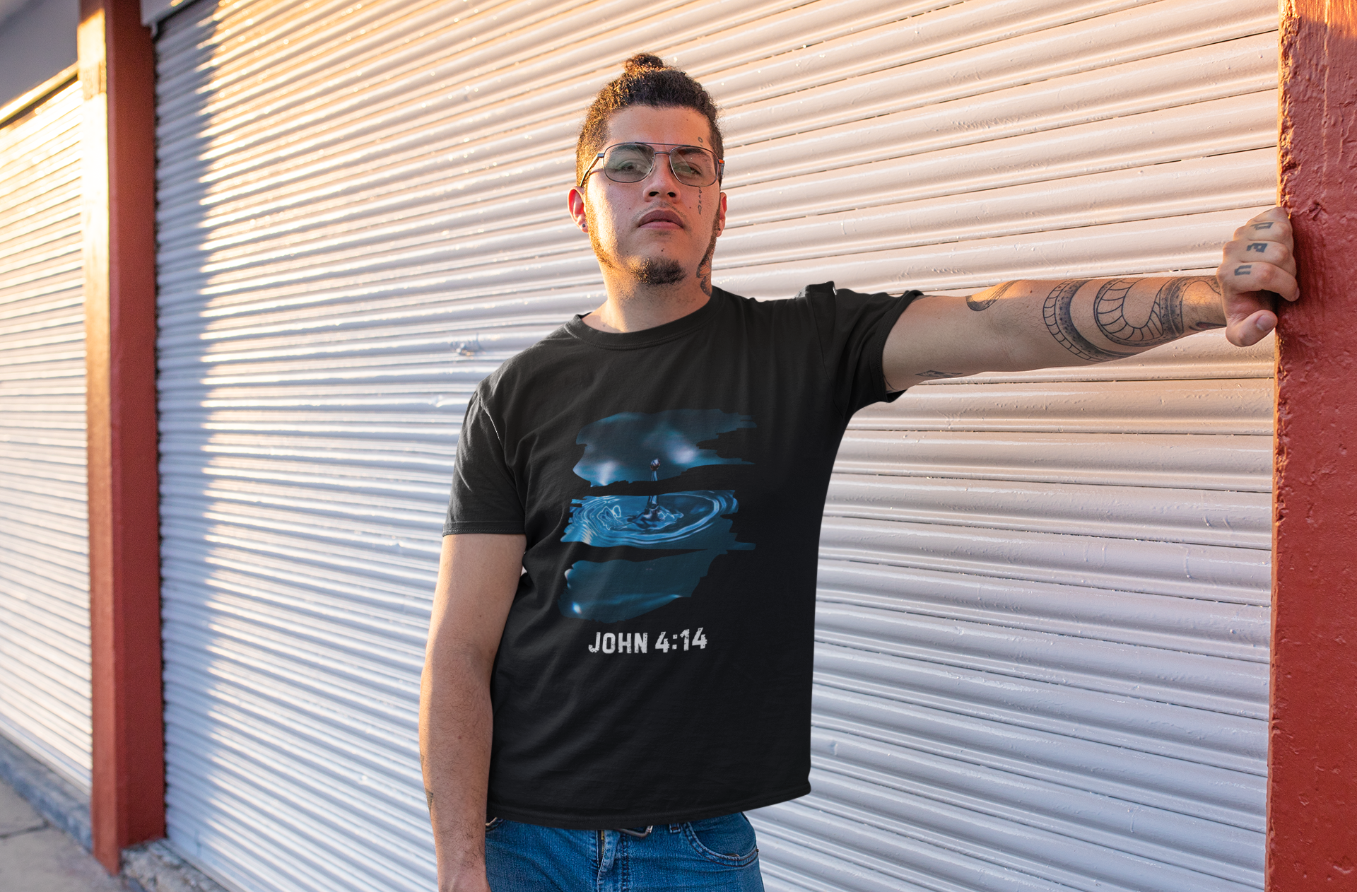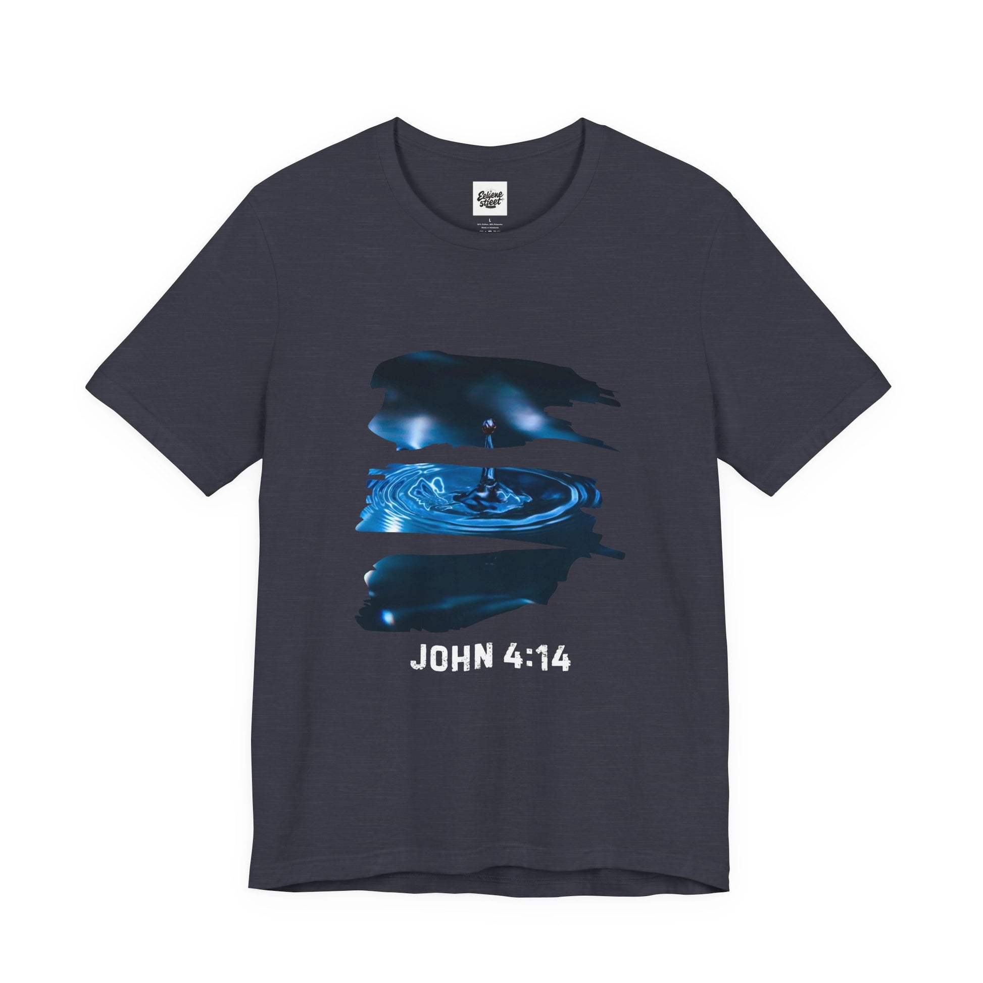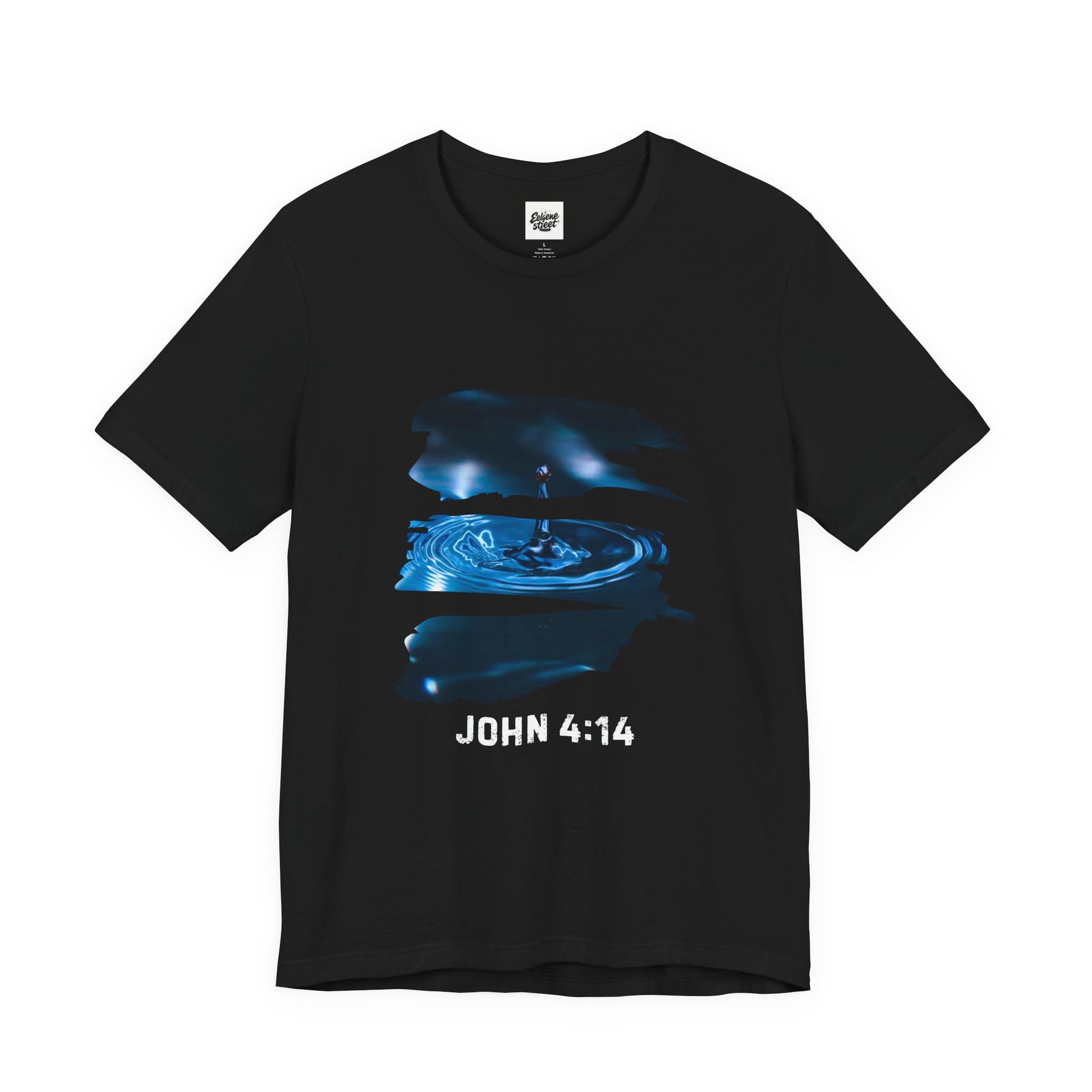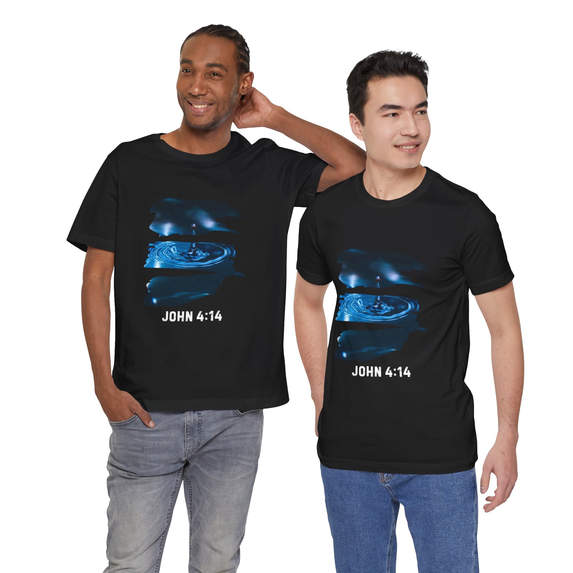 A fun and meaningful T-Shirt depicting Christ's provision of life-giving water as stated in John 4:14. Perfect for those seeking a spiritual and uplifting touch to their wardrobe, relevant for holidays and occasions centered around faith and spirituality.