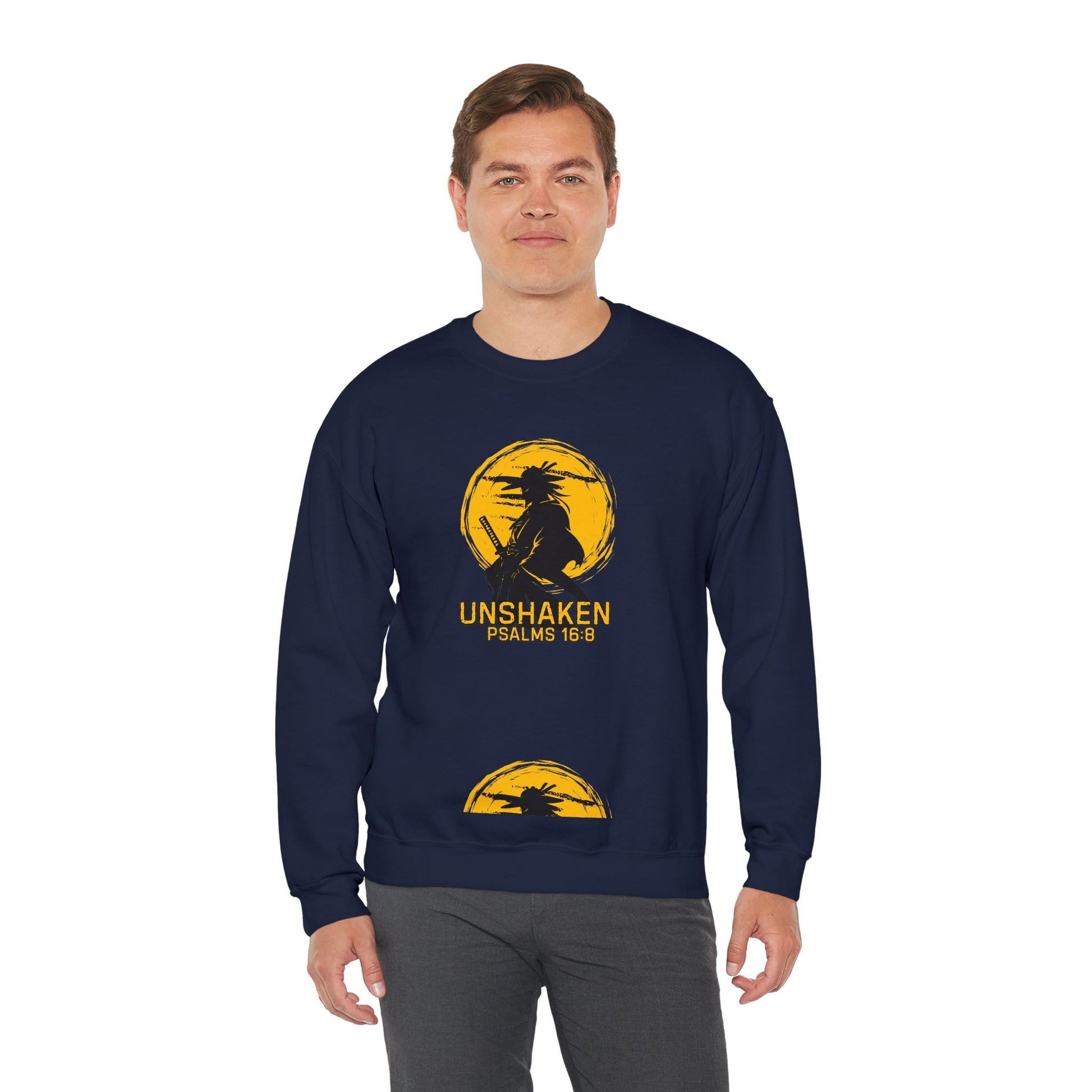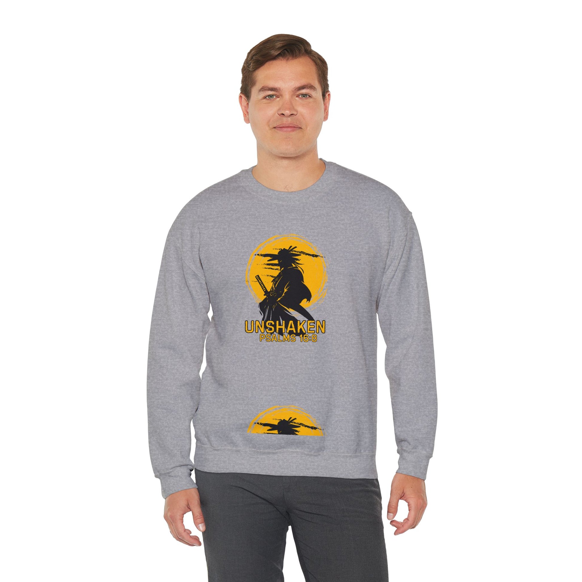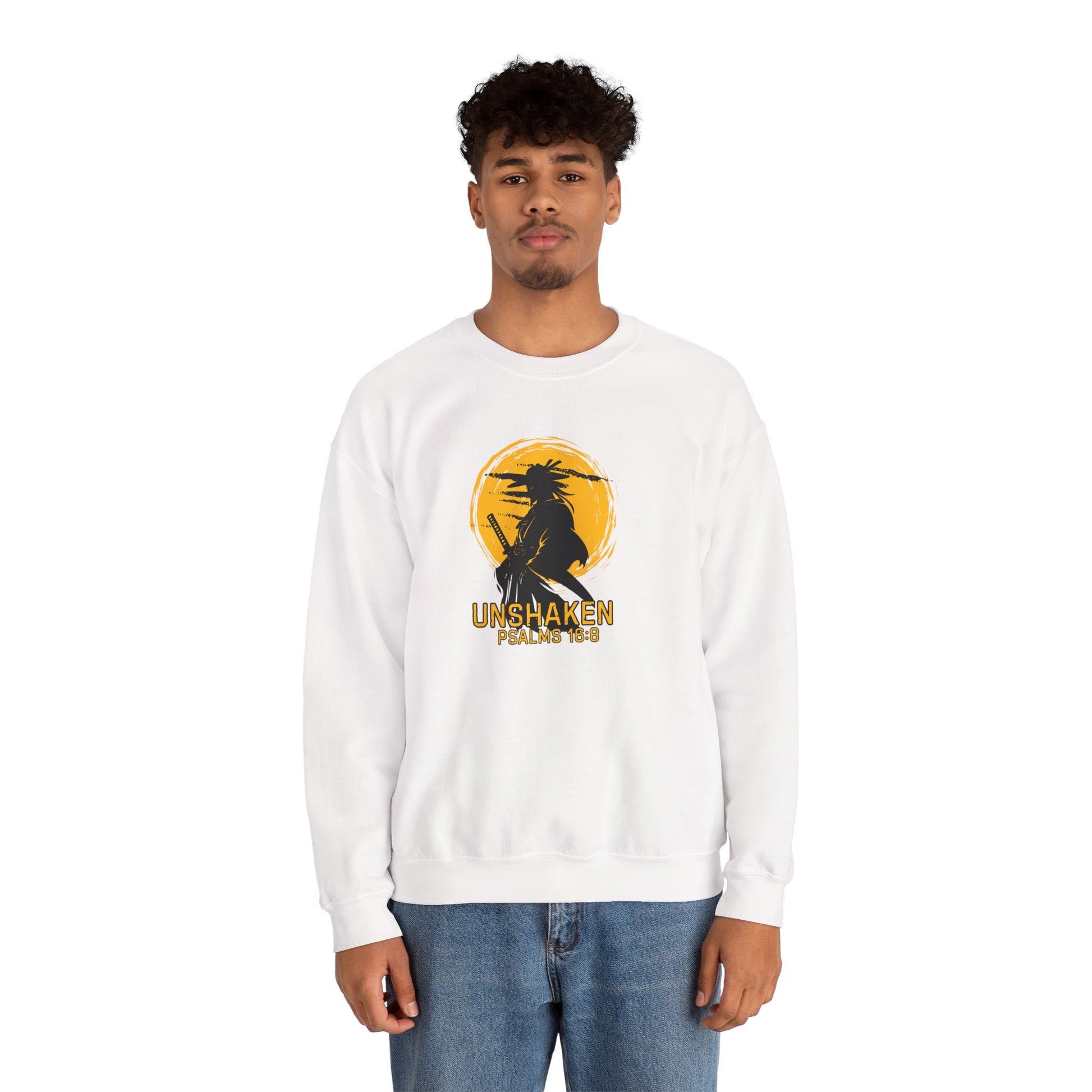 Unshaken Crewneck Sweatshirt — Psalms 16:8 Faith Graphic